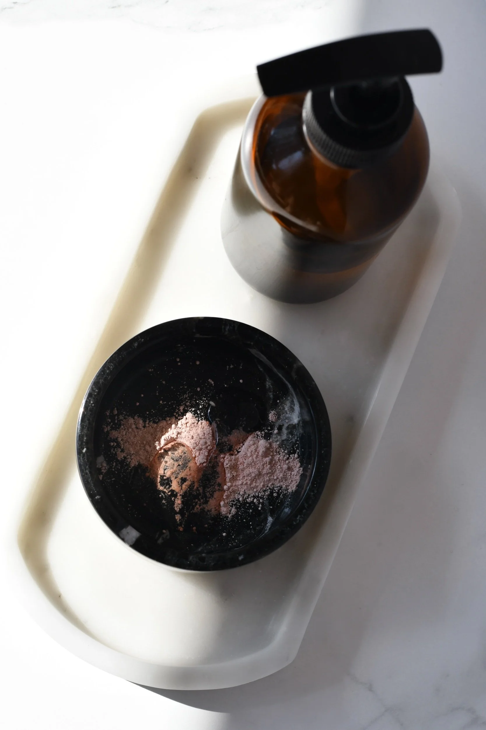 INGREDIENTS; PINK FRENCH CLAY, SANDALWOOD*, BUTTERMILK*, ROSE EXTRACT(10:1), AGED RICE (POWDER)*, ASHWAGANDHA*, TREMELLA*, PEARL, LEMON PEEL*, BRAHMI*, ROSE HIPS*, AMLA*, SAFFRON*